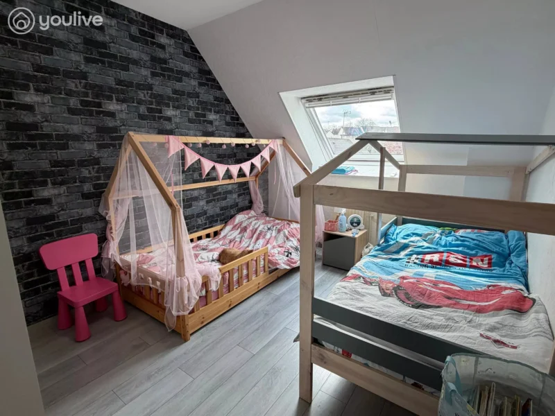 A l’étage vous trouverez trois chambres 🛏️ et un bureau (ou salle de jeux) et une salle de bain 🛁.