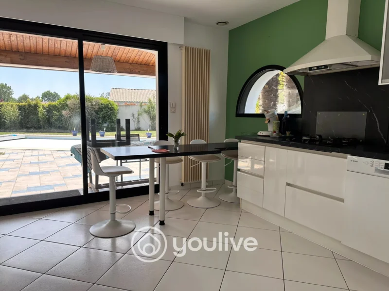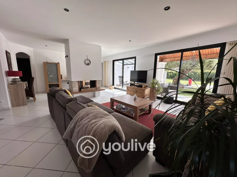 Le cœur de la maison est une spacieuse pièce de vie d’environ 50 m², agrémentée d’une cheminée et ouverte sur la terrasse et la piscine, créant un espace de vie agréable et convivial, parfait pour profiter des beaux jours.