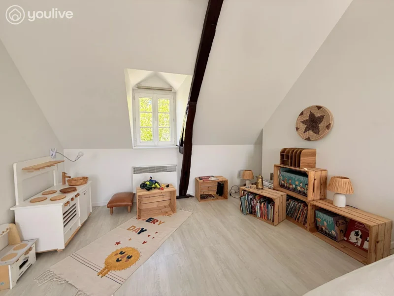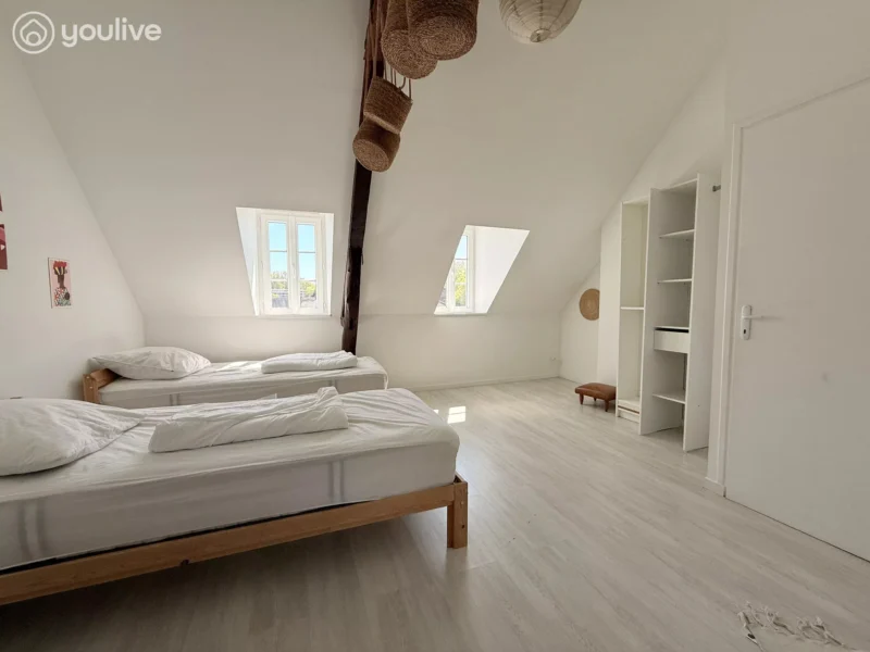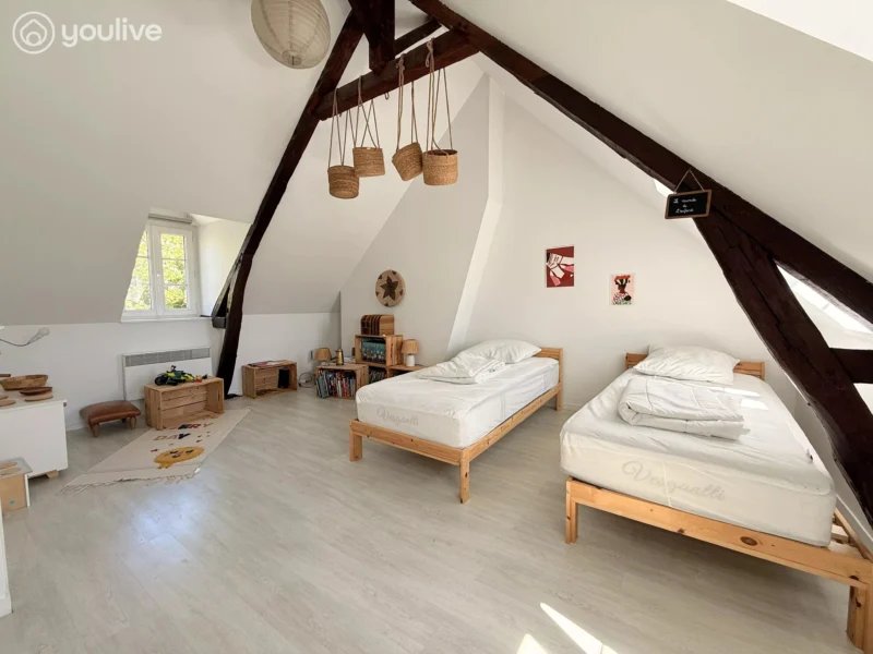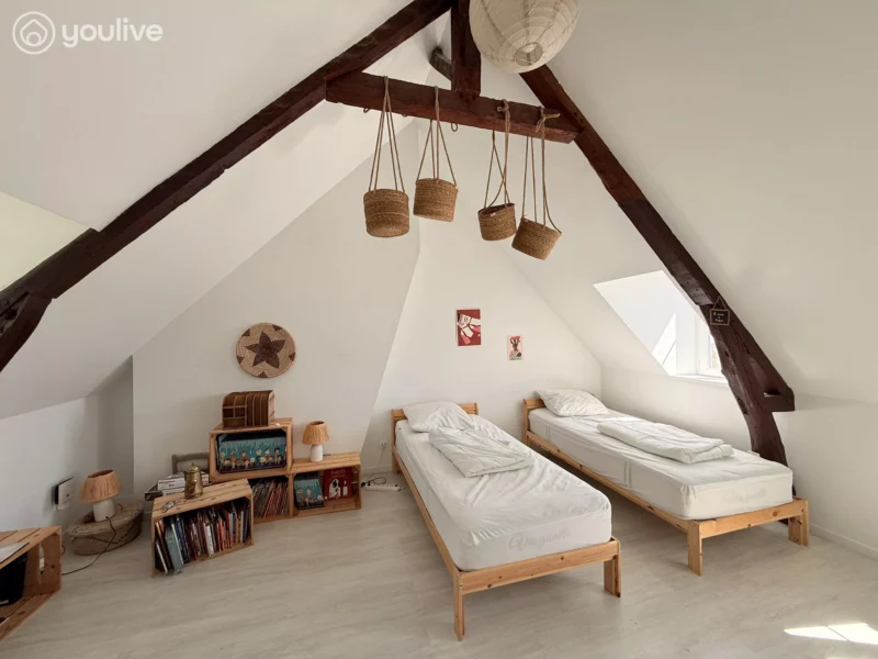 3ème étage : Une vaste chambre sous combles avec poutres apparentes, offrant une ambiance cocooning très appréciée.