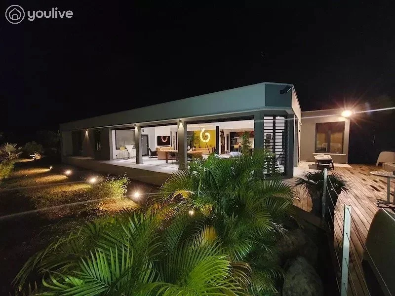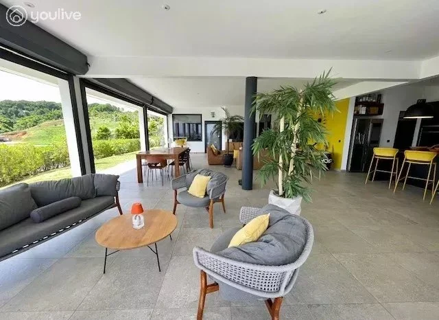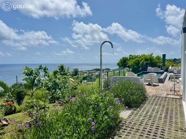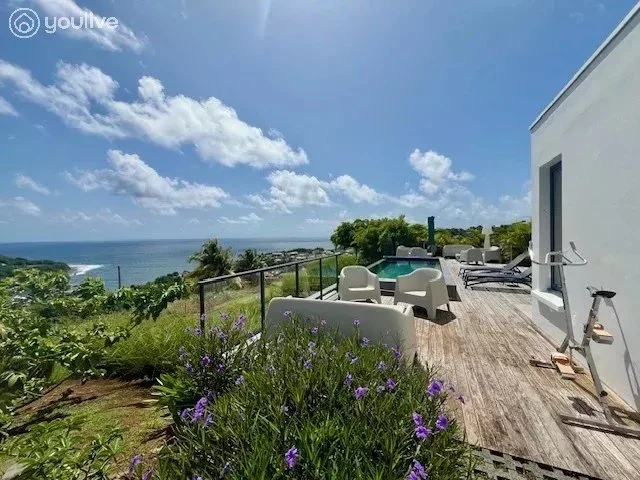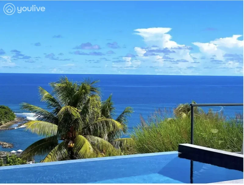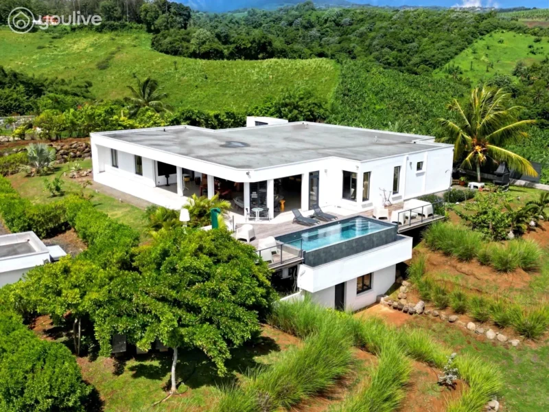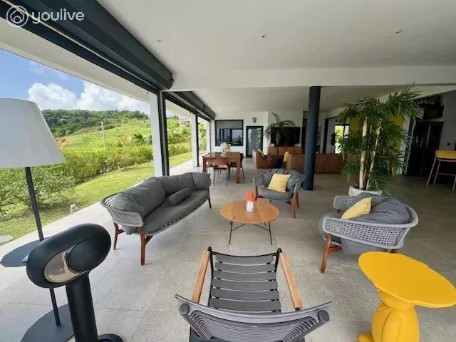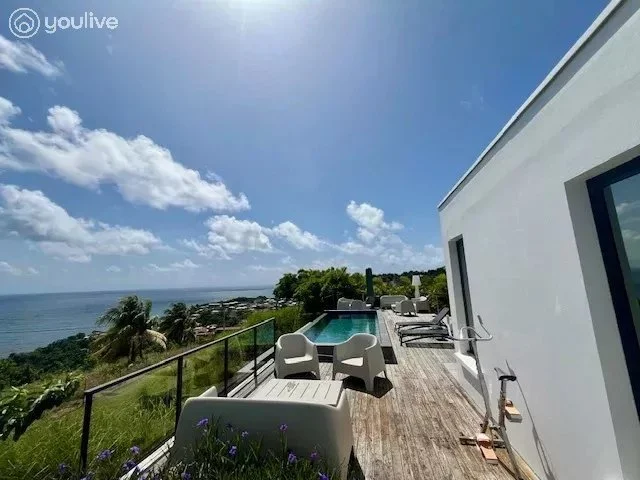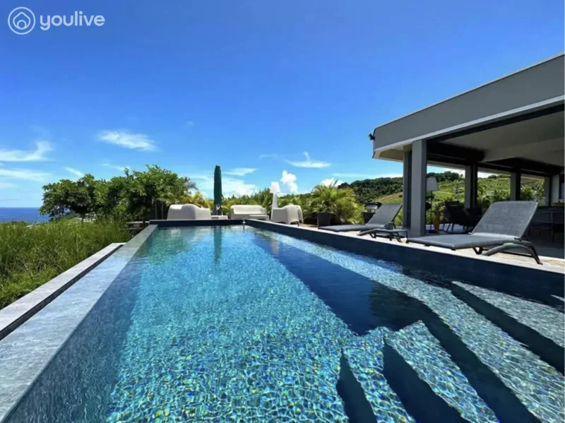 À 86 m d’altitude, face aux Pitons du Carbet, à la Montagne Pelée et jusqu’aux côtes de la Dominique, cette villa contemporaine de 381 m² habitables (plus dépendance 17 m²) offre un art de vivre rare, mariant lumière, confort et technologie.